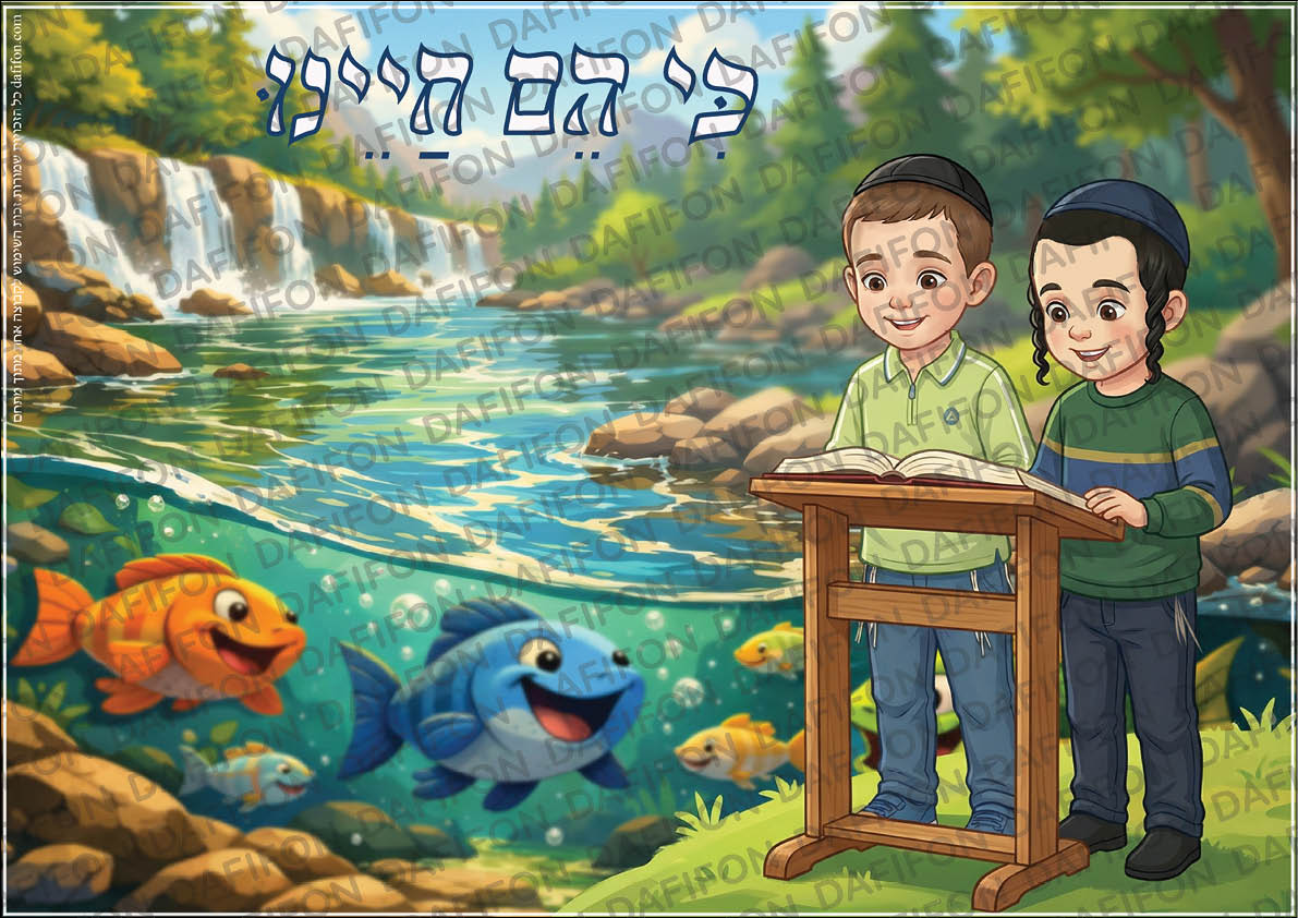 עם דגים .הכיתוב: "התורה היא חיינו"